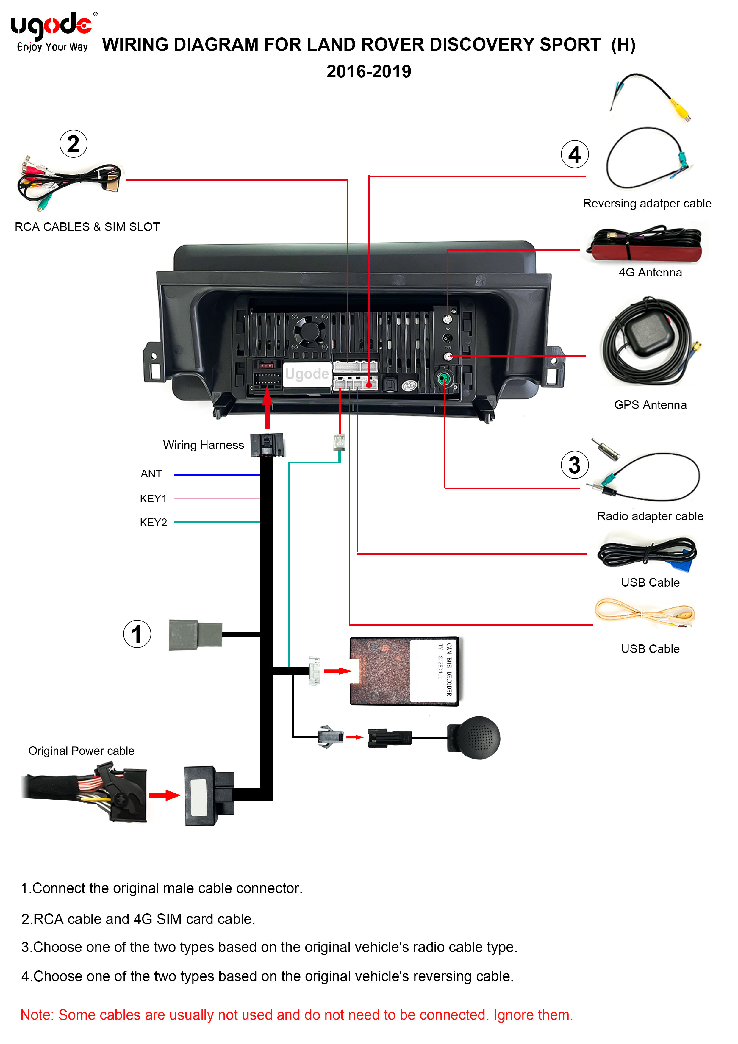 Note: Before installation, be sure to turn off the engine and remove the key to ensure the power source is disconnected. UGODE Android screen Land Rover Discovery Sport 2016-2019 Wiring Diagram Post time: Dec-25-2025