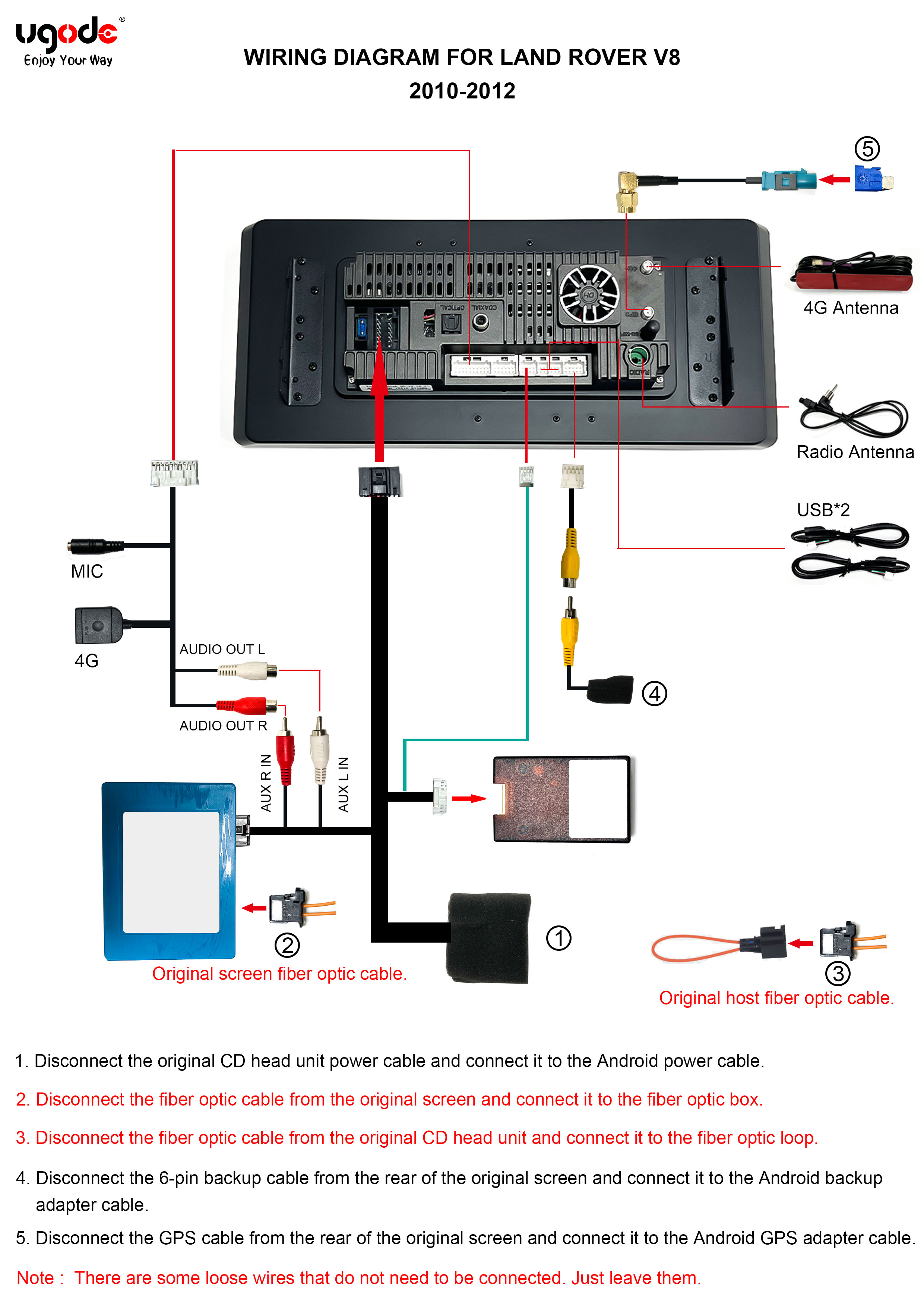 Note: Before installation, be sure to turn off the engine and remove the key to ensure the power source is disconnected. UGODE Android screen Land Rover V8 2010-2012 Wiring Diagram Post time: Dec-31-2025