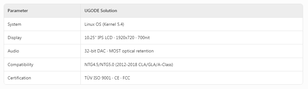 Solve 2016 CLA W176 CarPlay absence with UGODE’s Linux-based 10.25″ screen. Plug-play upgrade retains NTG5.0 functions. TÜV-certified.