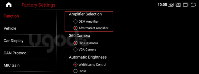 Routes:Settings-Factory(Key 2018)-Function-Amplifler Selection-Aftermarket Amplifler